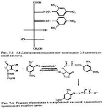 Для того чтобы преодолеть проблемы, связанные с присутствием в животных и растительных тканях веществ, поглощающих в УФ-области, проводился поиск реагентов, дающих специфические цветные реакции с L-аскорбиновой кислотой и(или) продуктами ее окисления. Титриметрический метод с использованием дихлорфенолиндофенола, описанный выше, был адаптирован для колориметрии. Для спектрофотометрического определения можно использовать и окрашенное 2,4-динитрофенилгидразиновое производное витамина. Обнаружено, что это же самое соединение образуется с дегидроаскорбиновой и 2,3-дикетогулоновой кислотами, являющимися продуктами окисления L-аскорбиновой кислоты (рис. 7.3). Эта реакция имеет широкое практическое применение для определения содержания дегидроаскорбиновой кислоты и известна под названием метода Роу. Он заключается во взаимодействии раствора дегидроаскорбиновой кислоты с 2,4-динитрофенилгидразином в специфических условиях при 37°С в течение 4 ч, в результате чего образуется озазон — производное 2,3-дикетогулоновой кислоты. Эту же реакцию можно использовать и для определения содержания L-аскорбиновой кислоты, предварительно окислив ее до дегидроаскорбиновой кислоты над активированным углем (норит) раствором брома и т. п. При добавлении к озазону сильной кислоты образуется раствор красного цвета, поглощающий при 530 нм.