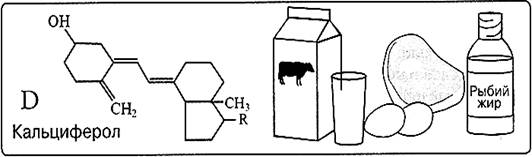 Витамин D способствует задержанию фосфора и кальция в организме человека и откладыванию их в костной ткани, регулирует содержание этих элементов в крови. Отсутствие приводит к развитию рахита у детей и размягчению костей (остеопороз) у взрослых. Следствие последнего – переломы костей. Кальциферол содержится в продуктах животного происхождения (мкг%): рыбьем жире – 125; печени трески – 100; говяжьей печени – 2,5; яйцах – 2,2; молоке – 0,05; сливочном масле – 1,3-1,5.
