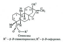 Стевиозид. Сладкий кристаллический гликозид, выделяемый из листьев растения Stevia rebaudiana (Парагвай, Китай, Япония, Корея). Хорошо растворим в воде, Ксл = 300. Термолабилен. Небольшие количества вызывают ощущение приятного сладкого вкуса, в больших количествах обладает горьким вкусом. Химическая природа стевиозида представлена ниже.