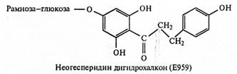 Неогесперидин дигидрохалкон (Е959). Подсластитель из кожуры цитрусовых. Получают модификацией нарингина, выделенного из кожуры грейпфрутов. Ограниченно растворим в воде, хорошо — в спирте. Высокая степень сладости (Ксл = 1800—2500) неогесперидин дигидрохалкона позволяет использовать его в значительно меньших количествах, чем остальные подслащивающие вещества, применять с другими подслащивающими веществами, при этом его подслащивающая способность значительно возрастает.