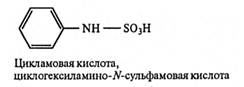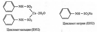 Цикламовая кислота и ее натриевая, калиевая и кальциевая соли — цикламаты (Е952). Соединения с приятным вкусом, без привкуса горечи, стабильны при варке, выпечке, хорошо растворимы в воде. Сладость в 30 раз выше, чем у сахарозы. Ксл = 30. Применяется в кондитерской промышленности, при производстве напитков и некоторых других пищевых продуктов. ДСД — 11 мг/кг массы тела человека (в пересчете на цикламовую кислоту).