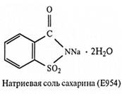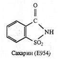 Сахарин, его натриевая, калиевая и кальциевая соли (Е954). Из синтетических подсластителей значительное применение находят сахарин-орто-сульфамид бензойной кислоты (белое кристаллическое вещество с температурой плавления 228—229 °С) и его натриевая, калиевая и кальциевая соли. Подсластитель «старого» поколении. Обладает горьковатым привкусом, это неудобство может быть устранено путем смешивания его с цикламатами.