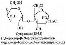 Сукралоза (трихлоргалактосахароза) (Е955). 1,6-Дихлор-β-D-фруктофуранозил-4-дезокси-4-хлор-α-D-галактопиранозид. Интенсивный подсластитель «нового» поколения.
