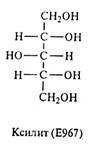 Ксилит (Е967) и сорбит (Е420). Влагоудерживаюшие агенты, стабилизаторы, обладают эмульсионными свойствами, оказывают положительное влияние на состояние зубов, увеличивают выделение желудочного сока и желчи. Сорбит и ксилит обладают энергетической ценностью 2,4 ккал/г (энергетическая ценность сахарозы 4 ккал/г). Сладость ксилита и сорбита по сравнению с сахарозой равна соответственно 0,85 и 0,6. Они практически полностью усваиваются организмом и не оказывают влияние на процентное содержание сахара в крови. Применяются в кондитерской промышленности, хлебопечении, при производстве безалкогольных газированных напитков и других продуктов диетического и диабетического назначения. Сорбит часто относят не к пищевым добавкам, а к новым видам пищевых продуктов.