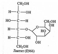 Лактит (Е966). Подсластитель, текстуратор. Многоатомный спирт, полученный гидрированием природного молочного сахара — лактозы. Сладость лактата составляет 40 % сладости сахарозы. Хорошо растворим в воде. Обладает чистым сладким вкусом и не оставляет привкуса во рту. Обладает в два раза меньшей калорийностью, чем сахароза, не вызывает кариеса зубов, может применяться при питании больных сахарным диабетом. По своим физико-химическим свойствам он близок к сахарозе и не требует каких-либо изменений при использовании в производстве мучных изделий.