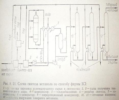 Жидкое сырье предварительно очищенное от сернистых примесей смешивают с водяным паром при температуре 800 – 850 С.Превращение сырья в синтез-газ осуществляется в присутствии никелевого катализатора. Тепло выделившееся в процессе используют для получения технологического пара. После охлаждения полученный синтез-газ сжимают до 5 – 10 МПа и направляют в реактор. Также можно использовать синтез-газ, полученный неполным окислением угля или нефтяных остатков в присутствии пара. Синтез на цинк-медном катализаторе ведут при 200–3000С и 5–10 МПа. В реакторе катализатор расположен слоями. Выходящие из реактора газы (6) проходят ряд теплообменников и поступают в сепаратор. Конденсат метанола подвергают испарению и направляют на ректификацию. Данный процесс характеризуется высокой производительностью и эффективной утилизацией тепла.