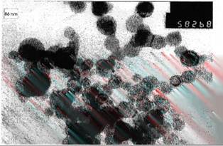 Внешний вид и цвет: порошок серого цвета. Точка плавления 640°С. Общий вид порошка изображен на рис. 1. Гистограмма распределения частиц по размерам изображена на рис. 2. Вероятностный (средний арифметический) размер аn = 77 нм; размер, размер средний по поверхности as = 89 нм; средний массовый размер аm = 103 нм. Электронная микроскопия высокого разрешения свидетельствует о наличии многочисленных кристаллических дефектов.