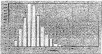 Рис. 2. Гистограмма распределения частиц порошка алюминия по размерам Ось ординат - число частиц, ось абсцисс - размер частиц в нм.