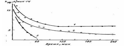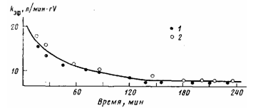 Рис. 1. Изменение эффективной константы скорости полимеризации этилена во времени в присутствии катализатора УС14/перлит — Al (изо-Bu) з. 70°, Al: V=22, [С2Н4] =0,018 моль/л, содержание ванадия на носителе 0,55 вес.%. Содержание кислорода в этилене 5 (1), 280 млн. долей (2)