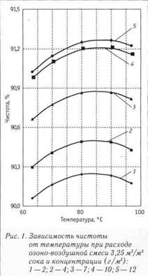С повышением температуры сока растворимость озона в нём уменьшается, но, как известно, увеличивается скорость химических реакций и соответственно скорость взаимодействия озона с неса-харами, поэтому при увеличении температуры процесса до 80 °С происходит интенсификация разложения и удаления не-сахаров.Повышение температуры выше 80 °С приводит к увеличению цветности и снижению эффекта очистки за счет значительного снижения растворимости озона в реакционной среде, хотя скорость химических реакций при этом достаточно высокая.