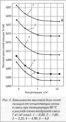 Повышение концентрации или расхода озоно-воздушной смеси выше экспериментально установленных значений практически не вызывает изменения показателей качества очистки диффузионного сока, к тому же при этом снижается коэффициент утилизации озона и значительно увеличиваются энергетические затраты. Следовательно, проводить очистку при таких параметрах нецелесообразно.
