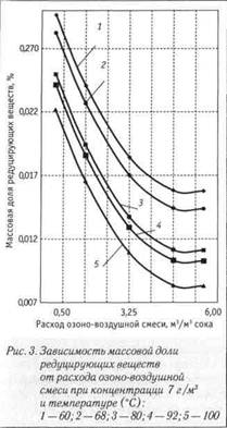 В связи с высоким окислительным потенциалом молекулярного озона при обработке дефекованного сока происходит интенсивное разложение моносахаридов, продукты разложения которых в щелочной среде окисляются с образованием устойчивых бесцветных соединений, что предотвращает цветообразование.