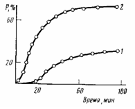 Рис. 4. Кинетика полимеризации метилакрилата (9 вес.%) в присутствии Ц-30 при условии предварительного выдерживания (1) и без предварительного выдерживания (2) размер капель микроэмульсии (определен методом светорассеяния) совпадает со средним размером стабилизированных эмульгатором Ц-30 и за-полимеризоваиных облучением капель микроэмульсии МА (найден по данным электронной микроскопии) и составляет 0,1—0,2 мкм.