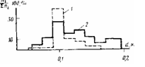 Рис. 5. Распределение по размерам частиц ПМА-латекса, полученного с предварительным выдерживанием (1) и без выдерживания (2)