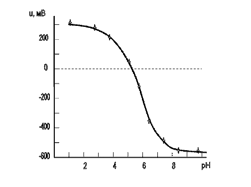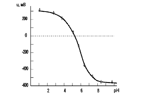 Соотношение ионов Н3О+ и OH-, адсорбирующихся на поверхности воды, и, следовательно, потенциал поверхности воды, зависят от исходного соотношения ионов Н3О+ и OH- в воде, т.е. от кислотности (рН) водной среды. Это подтверждается данными, приведенными на рис.2. Потенциал поверхности дистиллированной воды определяли по методике, описанной в работе [2]. Для изменения рН использовались водные растворы HCl и NaOH. Увеличение рН (щелочная среда) вызывает увеличение доли адсорбированных ионов OH- и, соответственно усиливает отрицательный заряд на поверхности воды. В кислой среде происходит снижение и последующая инверсия поверхностного потенциала. Величину рН, соответствующую нулевому потенциалу поверхности воды (5,4), назовем точкой нулевого заряда (ТНЗ).