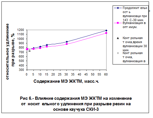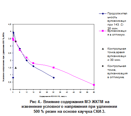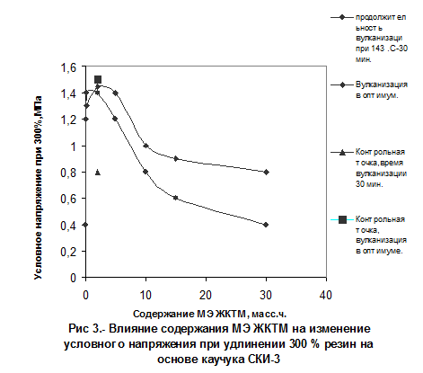 С помощью золь-гель анализа исследуемых и контрольных вулканизатов (свулканизованных за одинаковое время) удалось установить, что эти резины имеют одинаковую долю активных цепей, отличаясь содержанием золь-фракции и общей степенью сшивания: у резин с олеохимикатами содержание золь-фракции выше, а степень сшивания, определенная по равновесному набуханию, ниже.