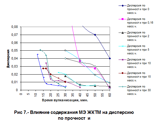 Уровень упруго-прочностных и деформационных характеристик анализируемых и контрольных вулканизатов, полученных в течение одинакового времени вулканизации, практически одинаков (табл. 21, 22).