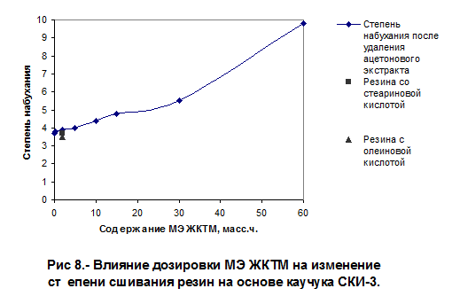 Степень сшивания резин, определяемая по величине набухания резин в толуоле, снижается с увеличением дозировки МЭЖКТМ в резине (рис. 8, табл. 18). Следует отметить, что уровень физико-механических характеристик резин с МЭЖКТМ и стеариновой и олеиновой кислотой практически одинаков, а однородность анализируемых резин выше по сравнению с контрольными резинами.