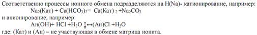 Метод ионного обмена основан на свойстве некоторых твердых тел (ионитов) поглощать из раствора ионы в обмен на эквивалентное количество других ионов того же знака. Иониты подразделяются на катиониты и аниониты. Катиониты содержат подвижные катионы натрия или водорода, а аниониты подвижные ионы гидроксила. В качестве катионитов применяют сульфоугли, алюмосиликаты, искусственные смолы, в качестве анионитов искусственные смолы.