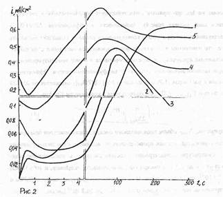 III - роста зародышей и разрастания их по поверхности в сплошной слой. Излом на восходящей ветви t - кривой может быть связан со структурными изменениями в оксидном слое. Линейный характер зависимости указывает на химическую природу затрудненной стадии уже на начальном этапе процесса.