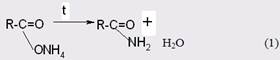 Одним из наиболее доступных и в то же время промышленно значимым является метод получения амидов через аммонийные соли карбоновых кислот [13]. Последние подвергают сухой перегонке (пиролизу), при этом выход целевого продукта достигает 87-90%.
