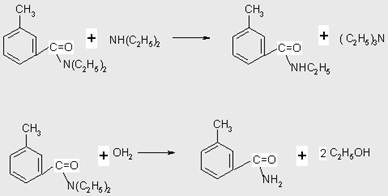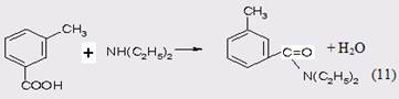 Представляет интерес метод поучения ДЭТА обработкой м-толуиловой кислоты диэтиламином в присутствии солей вольфрамовой кислоты, например, гидровольфрамата аммония [3] В процессе не требуется проводить одновременную отгонку воды, т.к. разлагающаяся при температуре синтеза соль вольфрама уводит воду, превращаясь в нерастворимую H2WO4. При температуре 200-2200C за 8 ч конверсия м-толуиловой кислоты достигает 75% при селективности образования ДЭТА 96%.