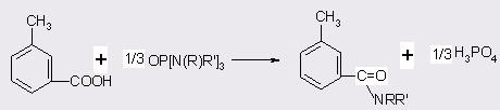 Применение в качестве катализаторов фосфорных кислот и хлорпроизводных фосфора [38] позволяет достичь 98%-ного выхода ДЭТА при температуре синтеза 250°С и давлении 1 МПа, процесс протекает в автоклаве в течении 6 ч. Катализаторы вводят в количестве 0,01 моля на 1 моль м-толуиловой кислоты, мольное отношение последней к диэтиламину 1:1,5. Применение алкиламидов фосфорной кислоты [39] в отношении к толуиловой кислоте 1-2:3 при 180-200°С к времени реакции 2 ч позволяет достичь выхода ДЭТА в 84%. В данном процессе реакция автокаталазируется фосфорной кислотой, которая образуется в результате разложения катализатора по схеме: