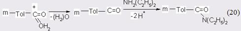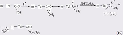 К лимитирующей, по-видимому, следует отнести стадию присоеинения диэтиламина, что не противоречит мнению других исследователей, изучавших аналогичные системы. В силу того, что процесс протекает на гетерогенном катализаторе при достаточно высокой температуре, не исключено, что протонированная молекула м-толуиловой кислоты отщепляет воду с генерацией карбаниона, на который в свою очередь может осуществляться электрофильная атака протонированного амина: