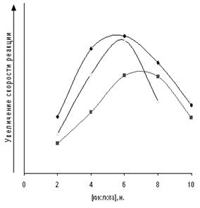 Рис. 3.3. Тенденция изменения скорости реакции амидирования МКТ от концентрации минеральных кислот. 1 − HClO4, 2 − HCl, 3 −HIO3.
