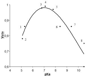 Рис. 3.4. Зависимость относительно скорости амидирования МКТ от величины рКа кислот, нанесенных на нейтральный оксид алюминия (Vотн для Al2O3 ок. 0,45): 1 − H2B4O7, 2 − H2Mo2O7, 3 − H3AsO4, 4 − H3PO4, 5 − H2TeO3, 6 − H2SeO3, 7 − H3BO3, 8 − H2TeO4.
