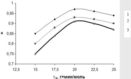 Рис. 3.5. Зависимость степени превращения МТК (α) от условного времени контакта (τ) при различных температурах: