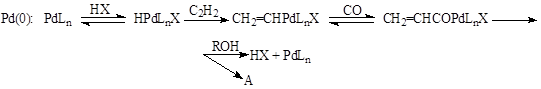 В первом случае вначале активируется спирт (SE), а затем СО и С2Н2, во втором – реакция начинается с окислительного присоединения HX, затем в реакцию вступают ацетилен, СО и ROH. Таким образом, выбор возможных стадий и схем механизма прежде всего определяется свойствами металлокомплекса в растворе или свойствами активного центра на поверхности.