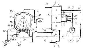 Отработанный раствор и отходящие газы, включающие аммиак, сернистый газ и пар, из аппарата 11 подаются по трубопроводу 12 в колонну разделения 5, где жидкая фаза отделяется от газов и паров. Испарение воды приводит к концентрированию раствора от исходной концентрации твердых веществ 15 до 25—40 %. При многократной циркуляции раствора по замкнутому циклу, включая трубопровод 6 насос 9, трубопровод 10, скруббер 11, линию 12 к колонну разделения 5, раствор может концентрироваться, причем концентрация твердых веществ, определяется теплосодержанием отходящих газов.