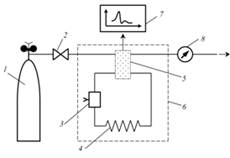 Рис. 1. Принципиальная схема газового хроматографа (1 − источник газа-носителя; 2 − вентиль тонкой регулировки скорости потока газа-носителя; 3 − устройство для ввода пробы; 4 − хроматографическая колонка; 5 − детектор; 6 – термостат колонки и термостат детектора; 7 − регистратор; 8 − измеритель скорости потока газа-носителя)