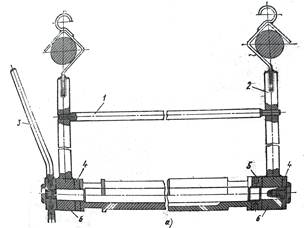 Рис 1. Подвески для хромирования деталей в горизонтальном положении: а - завешиваемая на две штанги ванны: 1 - траверса; 2 — штанга подвески; 3 — спица ворота для периодического поворота детали; 4 - уплотнительные диски; 5 - экран; 6 — втулки подвески; б — завешиваемая на одну штангу; 1 — рукоятка для поворота; 2 - крючок; 3 — траверса; 4 - винипластовые зубчатые колеса; 5 - штанга; 5 — муфты для крепления деталей