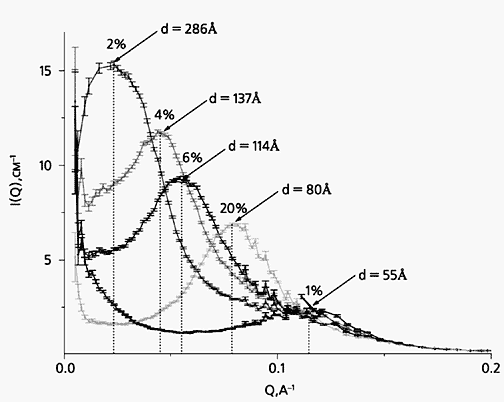 Размеры кластеров и среднее расстояние между ними чрезвычайно восприимчивы к рН среды, вызывающей ионизацию геля. Повышение степени ионизации с 2 до 20% приводит к сокращению среднего расстояния между кластерами с 22.4 до 8 нм и к существенному уменьшению их размеров [6]. Значительное изменение микроструктуры мы объясняем тем, что при повышении степени ионизации геля электростатическое отталкивание заряженных групп на поверхности кластеров вызывает их “дробление” на множество более мелких, в результате чего среднее расстояние между кластерами уменьшается. Из-за “дробления” повышается суммарная площадь поверхности кластеров и, соответственно, увеличивается расстояние между одноименно заряженными группами.