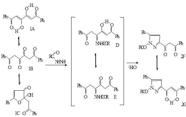3,4-Дигидрокси-1,6-дифенил-2,4-гексадиен-1,6-дион (1), существующий в растворе в виде двух цепных (1X), (1Y) и одной кольчатой (1Z) таутомерных форм, взаимодействует с гидразидами карбоновых кислот с образованием 4-ацилгидразонов 3-гидрокси-1,6-дифенил-2-гексен-1,4,6-трионов (D) и (E).Последние при дегидратации циклизуются с образованием 1-ацил-3-бензоилацетил - 5-фенилпиразолов (2F) и (2G).