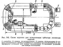 В СССР было осуществлено поточное производство пенистых латексных изделий с открытыми полостями (рис. 142). В латексную смесь при непрерывном действии вспенивателя подается воздух и желатинирующая композиция.