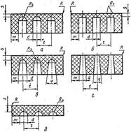 а - выемки в форме цилиндра с полусферой или неполной полусферой; б - выемки в форме цилиндра; в-выемки в форме усеченного конуса о полусферой или неполной полусферой; г - выемки сквозные в форме усеченного конуса; д - выемки в форме полусферы и неполной сферы.