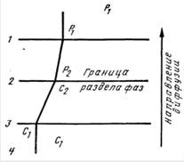 Рис. 19.1. Схема изменения давлений и концентраций газа на границе раздела фаз: 1,4 — газообразная и жидкостная фазы; 2, 3 — газовая и жидкостная диффузионная пленка