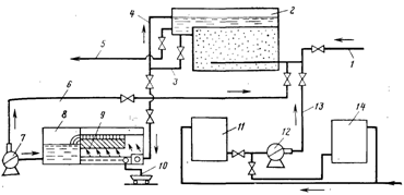1 и 5 — подача исходной и отвод очищенной воды; 2 — контактный осветлитель; 3 — сброс растворов после модификации загрузки; 4— переудив; 6 — подача промывной воды от насоса 7; 8 — резервуар промывной воды с тонкослойными модулями 9; 10 — утилизация осадка; 11 и 14 — бак для приготовления раствора КМn04 и FeS04; 12 — насос-дозатор для подачи модифицирующих растворов по реагентопроводу 13