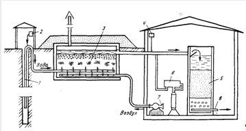 1 — трубчатый колодец с погружным насосом; 8 — отвод обработанной воды; 2 — дозатор биогенных (азотных, фосфорных) соединений; 3 реактор биохимического окисления; 7 — воздуходувка; 6 — хлоратор; 4 дозатор сульфата алюминия; 5 — скорый фильтр.