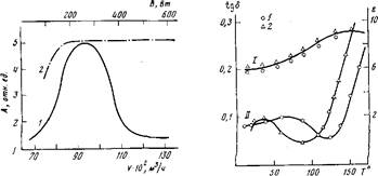 Рис. 2. Зависимости диэлектрической проницаемости е (I) и тангенса диэлектрических потерь tg б (II) от температуры для пленки ПВХ: 1 – контрольный образец, 2 – образец, выдержанный 7 ч в атмосфере озона