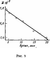 Рис. 3. Изменение молекулярной массы ПС во времени в процессе его взаимодействия с озоном (СС14, 20°)