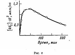 Рис. 6. Характер изменения концентрации R02» при озонировании порошка ПС ([Оз]=1,74–10-4 моль/кг, поверхность образца 6 м2/г)