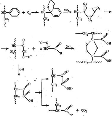 Присоединение первой молекулы озона к ароматическому циклу нарушает сопряжение и значительно облегчает присоединение двух следующих молекул. Первичные озониды нестабильны и легко распадаются на фрагменты, которые быстро соединяются вновь, изменив на 180° пространственную ориентацию (реакция (1а)), либо изомеризуются (реакция (16)). На схеме реакция (1а) приведена условно, демонстрируется та ее часть, которая приводит к появлению сшивок.