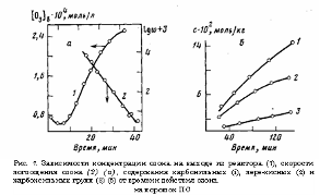 Увеличение концентрации радикалов в начальном периоде, по-видимому, связано с образованием в системе одного или нескольких промежуточных продуктов, которые реагируют с озоном легче, чем исходный ПС. На рис. 7 представлены результаты исследования зависимостей концентрации озона при выходе из реактора и накопления стабильных конечных продуктов от времени [30]. Видно, что по мере протекания реакции скорость поглощения озона вначале возрастает, а затем уменьшается. Минимум на кривой [Оз]в – t отвечает максимуму на кривой [R02] – t (рис. 6). Вос-> ходящая ветвь зависимости [03] в – t (рис. 7, а) спрямляется в полулогарифмических координатах (первый порядок расходования третичных С–Н-связей), что тоже соответствует сказанному выше. Природа промежуточного продукта, способного эффективно образовывать радикалы, неясна, поскольку на кривой накопления основных функциональных групп сходных изменений обнаружить не удалось. Расход озона на образование 1 моля функциональных групп составляет 1,4±0,3 моля.