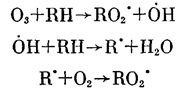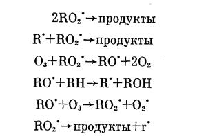 В зависимости от концентрации реагентов, подвижности полимерной матрицы, условий опыта и от природы ближайших соседей механизм превращения перекисных радикалов в продукты реакции может быть различным. При небольших концентрациях озона в растворах преобладают процессы распада макромолекулярных перекисных радикалов, поскольку малая подвижность полимерных цепей препятствует бимолекулярному взаимодействию макрорадикалов. Гибель свободной валентности происходит при встречах вторичных низкомолекулярных радикалов друг с другом и с макромолекулами.