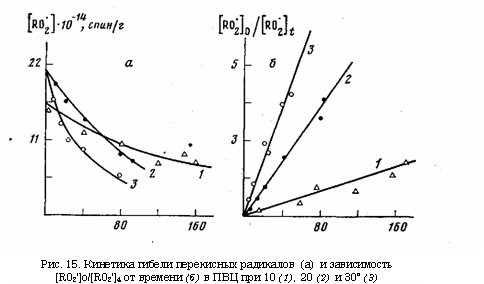 В ПС, ПВЦ и поликарбонате формы сигнала ЭПР сходны с сигналом перекисного радикала. В ПЭ возникал сигнал более сложной формы, который, возможно, представляет собой наложение сигналов двух различных радикалов. После прекращения подачи озона перекисные радикалы исчезали в течение нескольких минут; в полимерах, содержащих ароматические кольца, вместо них появлялись парамагнитные частицы, дающие узкий синглетный спектр (Д#=8,5 Э). Повторная подача озона в систему приводит к превращению этих частиц в перекисные радикалы. В отсутствие озона концентрация частиц практически не изменяется в течение месяца, а при повышении температуры они постепенно расходуются. Кинетика гибели перекисных радикалов была изучена на примере ПВЦ. Результаты опытов по изучению гибели перекисных радикалов в ПВЦ на воздухе для различных температур приведены на рис. 15. Как следует из рисунка, после прекращения подачи озона концентрация радикалов постепенно уменьшается, при этом изменения формы ЭПР-спектра не происходит. Скорость гибели перекисных радикалов подчиняется закону второго-порядка. Измеряя абсолютные начальные концентрации радикалов, удалось определить значения кинетических параметров реакции, а из температурного хода константы скорости оценить энергию активации гибели радикалов. Зависимость константы скорости от температуры можно описать уравнением