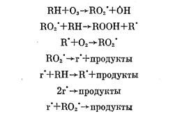 По-видимому, при низких температурах миграция свободной валентности определяется главным образом реакциями, следующими за распадом перекисных радикалов по схеме, включающей ряд элементарных стадий